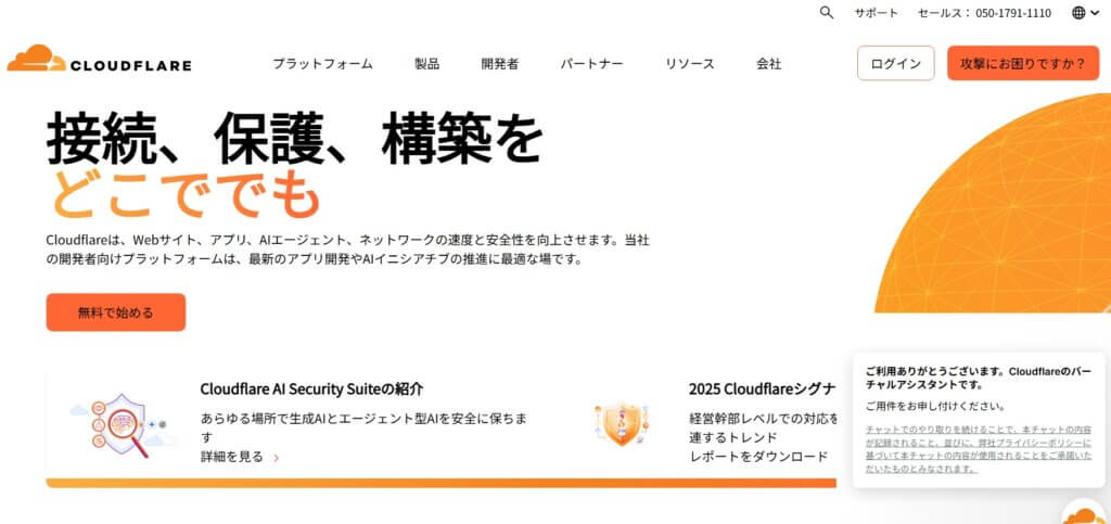 1. Cloudflare公式サイト にアクセスし、「利用開始」をクリック。