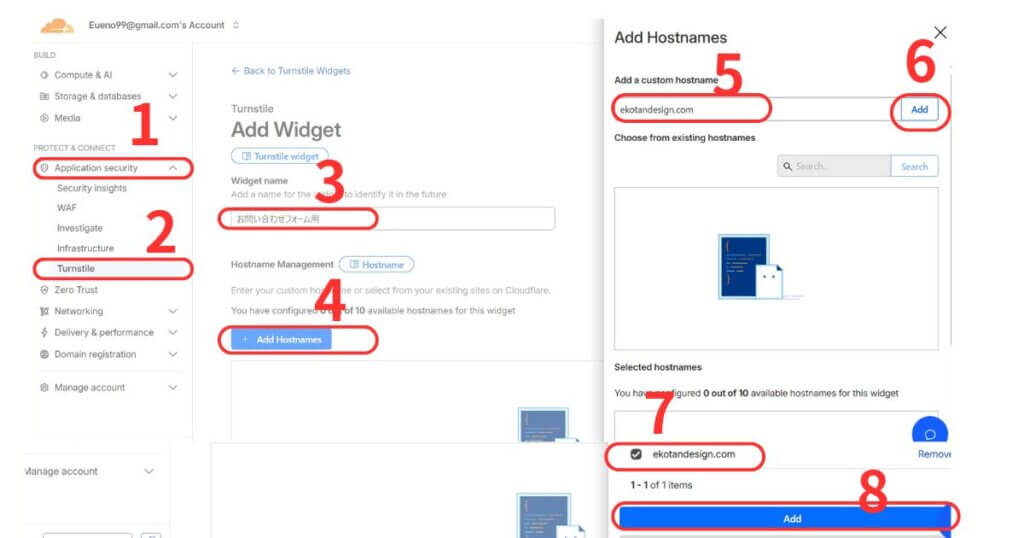 ステップ2:Turnstileウィジェットを追加してホスト名を登録