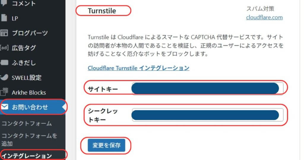 3. Cloudflareで取得した「サイトキー」と「シークレットキー」を入力。